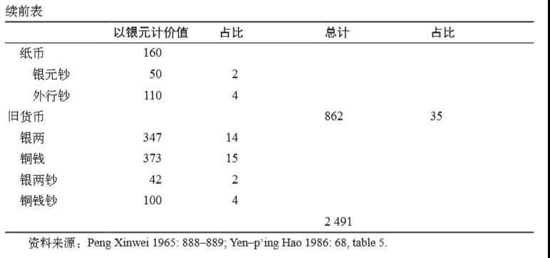 墨西哥银币进口的再次飙升,带来了19世纪下半叶最为重要的货币扩张。从1850年代开始,中国再次出现白银的净流入,到了1870年代,随着中国多数贸易伙伴采取了金本位制度,中国的白银流入也达到了新高。墨西哥银元普遍应用于商业交易,成为事实上的货币本位,即“圆,元”。 1889年,广东省开始发行清政府认可的法定银圆(及辅币铜钱)货币。但由于1850年代法定货币实验的流产给中央政府带来了巨大阴影,清廷一直拒绝重新引入纸币。外资及中资银行都发行了自己的纸币,但这些纸币的流通范围有限。到清朝末年,中国仍然主要以银币作为其主要货币,而流通中的各种类型的纸币,加起来也就占货币总发行量的12%(见表9.8)