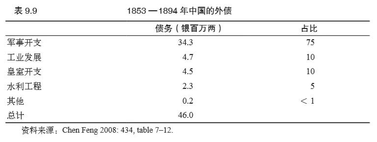 公共财政最显著的变化发生在1890年代,此时,清政府打破了长期的治理原则,开始诉诸赤字财政。自太平天国运动爆发开始,出于军事需要,省级政府开始小规模举借外债,后来中央政府也加入了这一行列。在40余年中,清朝的外债仅有4600万两白银(见表9.9)。