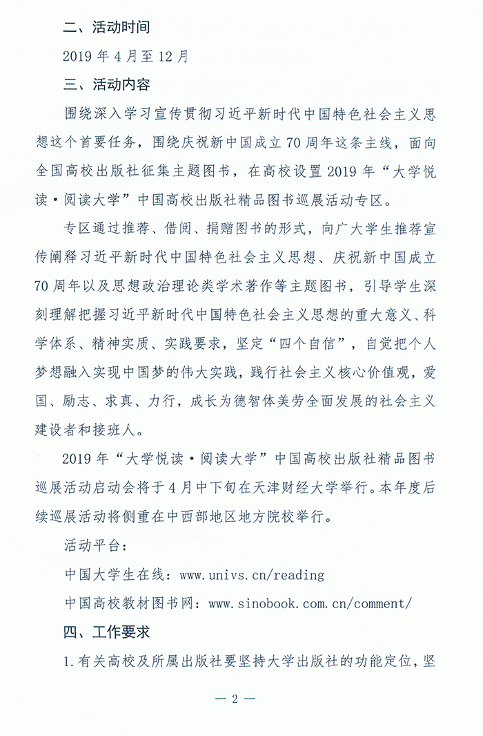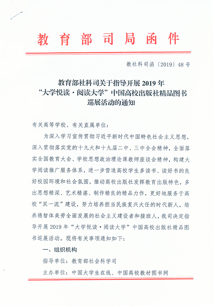为深入学习宣传贯彻习近平新时代中国特色社会主义思想,深入贯彻落实党的十九大和十九届二中、三中全会精神,全面落实全国教育大会、学校思想政治理论课教师座谈会精神,构建大学阅读推广服务体系,进一步营造高校学生多读书、读好书的良好校园环境和社会氛围,推动高校出版社发挥教育出版特色,多出思想精深、艺术精湛、制作精良的精品力作,更好地服务于高校“双一流”建设,努力培养担当民族复兴大任的时代新人,培养德智体美劳全面发展的社会主义建设者和接班人,我司决定指导开展2019年“大学悦读•阅读大学”中国高校出版社精品图书巡展活动。现将有关事项通知如下: