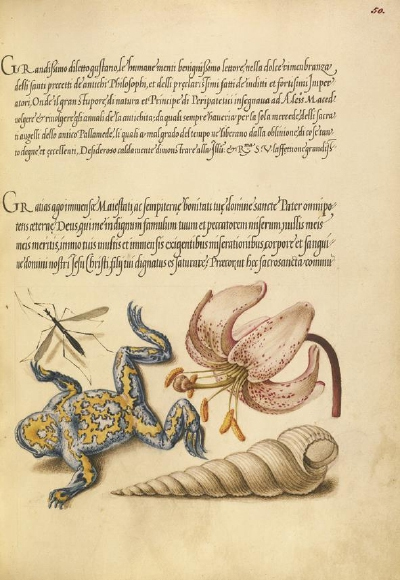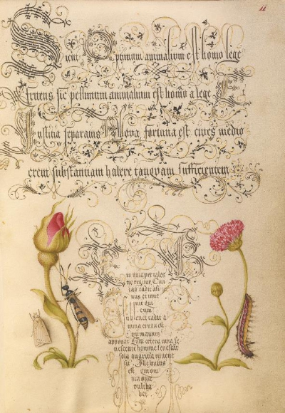 ▲青蛙与百合,黑种草,毛毛虫、马峰与飞蛾,均出自16世纪欧洲古书《了不起的书法古迹》。