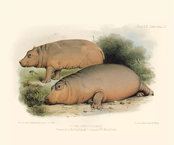 奥巴亚斯科(Obayasch,1849-1878)在等待前往伦敦动物园时,绘于英国领事馆的开罗花园。领事默瑞先生(Mr.Murray)形容这些河马就像纽芬兰的小狗一样顽皮。动物学会的首席画家约瑟夫·沃尔夫根据草图为这些可爱的小家伙上了色。