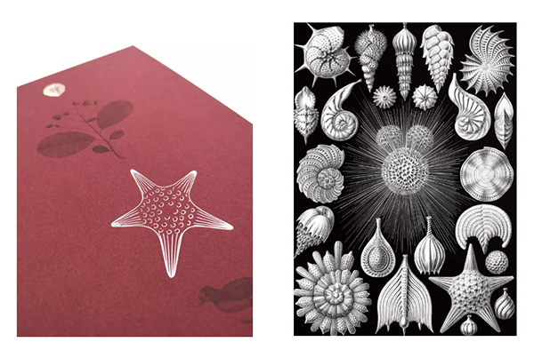 内封采用了日本进口五彩绒面纸,覆硬纸壳,坚固不易磨损,中心有一处古老的单细胞海洋动物“有孔虫类”,烫印珠光白,颜色绚丽多彩。