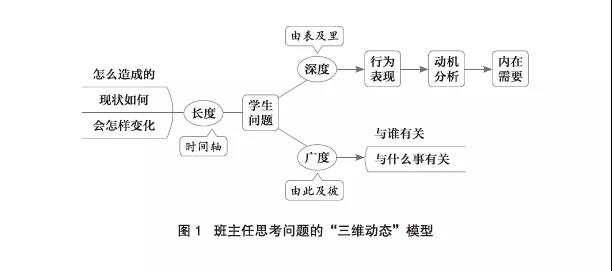 要想让班主任工作更有专业性,就必须不断思考。“思考,思考,再思考”,这是我在一次大型会议上对班主任的建议。比如,把任何学生问题放在一个“三维动态”模型中去研究(见图1)。