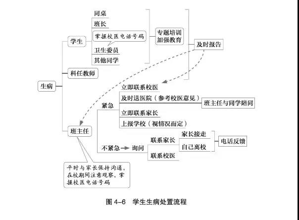 班级是否需要对学生进行一些常见疾病的简单处置训练,班主任可以根据有无合适的资源和时间、空间自定。但至少,班主任、班级卫生委员应该掌握校医的电话号码,熟悉校医务室地点。班主任与家长要有常态的联系,要及时关注天气状况,及时提醒家长。对班级中有慢性病和既往病史的学生要做到心中有数,平时注意观察学生的脸色、状态,一旦发觉情况异常,要及时询问。有心的班主任亦可自学一些医疗基本常识。无论是学生还是科任教师,一旦发现有人状况不对,即可按照图4–6所示流程处置。