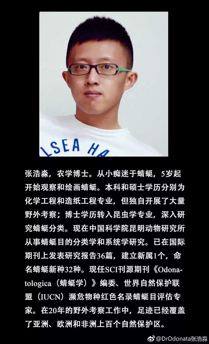 这些图片来自中国科学院昆明动物研究所的张浩淼博士,他被美国最著名的蜻蜓学家Rosser Garrison誉为“蜻蜓神童”。2011年在攻读博士期间就受邀访问世界蜻蜓学发源地荷兰国家博物馆,也是当代唯一受邀访问世界蜻蜓学发源地的中国蜻蜓学家。