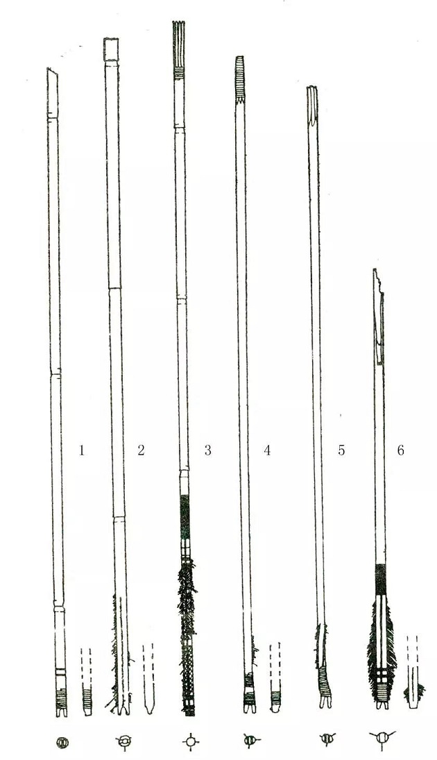 有的比较简单,在箭杆尾端削出搭弦槽(专业术语谓之“叉”),槽内横劈一缝加入小木楔用以扩宽槽尾,外缠藤篾并涂红色漆料,加固并装饰杆尾,最后竖贴三条用以定向的尾羽就成了,只要再安装上铁镞就能投入使用。有几支做工考究的箭杆工艺比较复杂,杆头内壁刮薄,劈成4瓣,削出斜角缝以便夹持铁镞。外缠藤篾并涂褐漆,杆尾端嵌入有搭弦槽的细木柱(专业术语谓之“括”),自尾端向上依次缠红、绿、黄、蓝四色棉线,在竹杆上精心绘出蓝底金色网纹和红底金色水波纹,杆尾四周竖贴四条定向尾羽,总长度80多厘米。像这种装饰华丽,制作起来费工费时的箭杆绝非普通士兵能大量配备的,很可能是王室卫队的专用品。