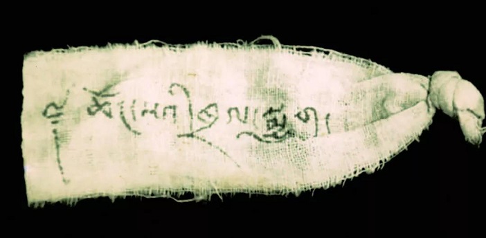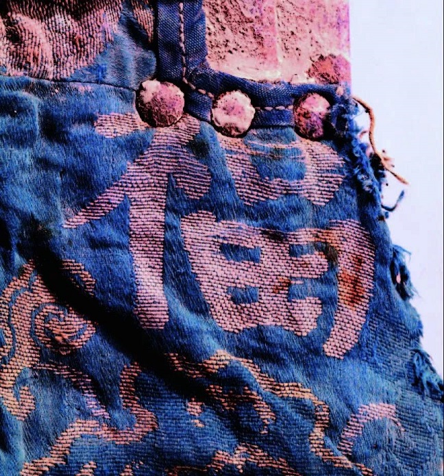 另一类很可能是叫作“披膊”的甲衣,仅能遮护领部、肩部及前胸后背的上半部。因为结构比较简单,这种甲衣只用三种甲片,领部用一种10孔甲片单排横列连缀,内包衬羊皮以免磨伤脖颈,后背的中脊部用方形6孔甲片竖排一列,两侧其他部位都用弧端条形的9孔甲片连缀。这种披膊防护部位有限,很可能是配合身甲在使用的。残甲衣中最为讲究的是一对护腿。5排长条形铁甲片列成横排铆钉在底衬上,底衬的面料是漂亮的蓝底福寿字灵芝纹妆花缎,中层是靛蓝方格棉布,底层是本色白棉布,护腰部分还在中层和底层之间夹敷薄薄一层棉花。甲衣底衬使用的所有材料都是古格王国时期的“进口货”,经纺织史专家鉴定,表层的妆花缎是明代江南织造的织物,各色棉布有可能来自印度。这两件从山顶王宫区采集的甲衣护腿部分,无疑是王室成员曾经使用过的高级甲衣残片。