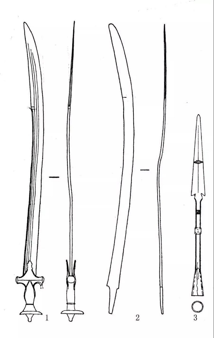 遗址中发现的刀、剑、矛等近距离格斗兵器很少,但都制作得很精细。其中有一种弯刀很有特色,刀身前半部略弯,刀尖薄锐,两侧均有刃,刀身的后半部又变成平背单刃,两面开有长血槽,能砍能刺。刀柄呈十字形,手握部位圆滑适手,原有后弯的护手片,后档圆盘以锥形铁板铆钉,整个刀柄表面在制作时曾经处理过,现在局部还能看到蓝色光泽,通体长84厘米。这件刀长短适度,轻重得宜,造型匀称美观,虽然没有嵌金镶玉,但无疑是刀中精品。完整的铁矛只发现一件,矛身细长尖锐,铤部中间装饰一个16面体凸结,末端是圆形的銎。
