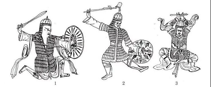 遗址采集到的甲衣或缺襟或少袖,已经无法看出原来的整体原貌。所幸城堡中的白殿、红殿、大威德殿壁画中保留有一些铠甲武士的图像可资参考比较。武士像所穿着的铠甲均为一种长不过膝的对襟半袖甲衣,衣襟和下摆及袖口露出织物或皮革的镶边,腰系布带扎紧甲衣,很像前面描述的第一种甲衣。不过壁画中都是半袖,而实物中多为长袖而已。为了进一步为古格王国的残甲衣找到可以比较的资料,笔者查阅了宋代官修的军事著作《武经总要》。发现书中收录的宋代披膊和古格王国发现的第二种甲衣很相似。再查找明代的甲衣,可以找出与古格妆花缎护腿残甲衣形制类似的记载。
