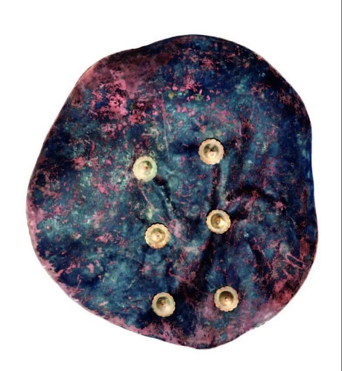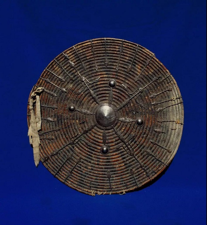 数量较多的另一类藤盾牌就要大得多了,直径都在70—80厘米,中央没有木盘,藤条直接盘绕成型,中心稍稍外凸,略显锥形。藤条之间用藤篾缠绕紧密,成型后在盾牌正反面绘出放射状的装饰图案,正面再铆钉铁饰件或铜饰件。大多数饰件上有镂空花纹和錾刻花纹,既可加固藤牌又使得表面美观。其中有几件表面铆钉的饰件非常复杂,中央固定一个大的圆锥形泡饰,泡饰周围加工出镂空花纹;外面一周环绕着4到8个小的尖锥形泡饰,镂空的铁条沿四周呈放射状密密麻麻铆钉。有些藤盾牌里面还衬有羊皮,以皮条做成把手。