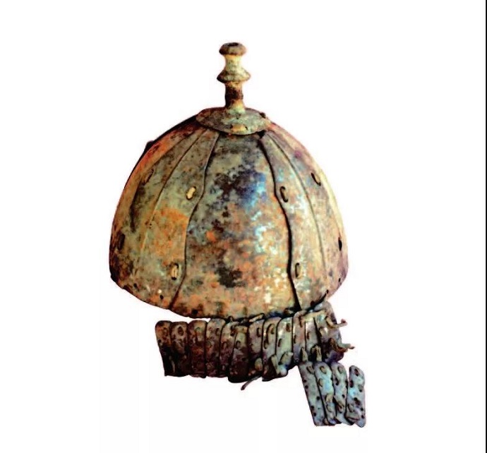 古格壁画中的武士不仅身着铠甲,头上还戴有头盔,一手持盾牌,一手挥动剑或短戟作拼杀格斗状,使我们得以一睹古格将士当年的风采。从壁画上看,古格武士的头盔由盔顶、盔帽片和甲片护颈构成。盔顶饰有红缨或插有小旗,也许是作为在战场上厮杀中辨识敌我的标识,我们在城堡中采集到4种盔顶、十几种形状稍有差别的盔帽片。盔顶大体上都呈喇叭状,上面的顶柱上凸出一到两圈凸棱,下面喇叭口一周钻出8个小孔,可以用皮条连缀盔帽。盔帽片分为底片和表片两类,都在两侧、上端及底缘钻有小孔,两侧的孔是连接相邻盔帽片的,底缘的孔连接护颈甲片,顶部的孔连接盔顶。在发现的盔帽片中有一件底片和表片的连缀皮条尚未断掉,连缀形式总算清楚。而且下缘还残留两排护颈甲片。我们从采集的盔帽片和护颈甲片中选出相同类型的,再配上一个盔顶,用皮条连缀复原出一个头盔的大体形状。接着,我们又对所有盔帽片作了分类搭配,至少能组合出6种大同小异的盔帽。由于没有发现较为完整的盔帽实物,对头盔内是否有内衬及内衬的材质已经不得而知了。