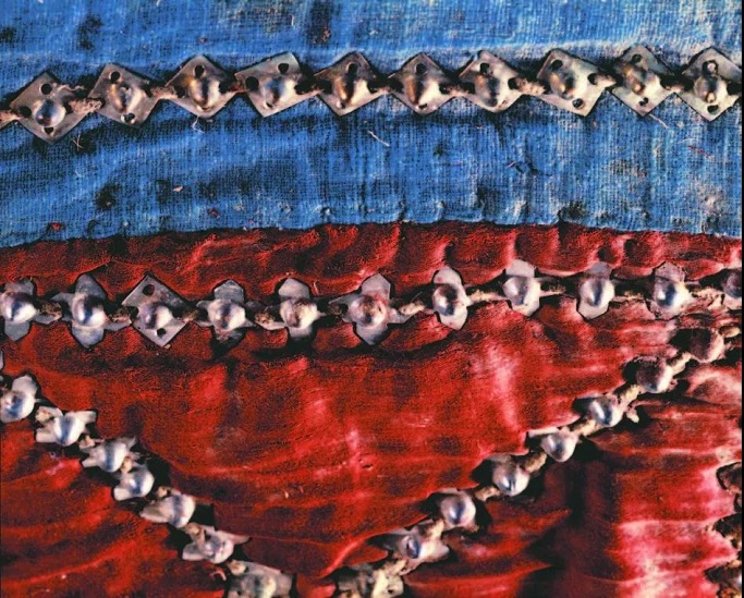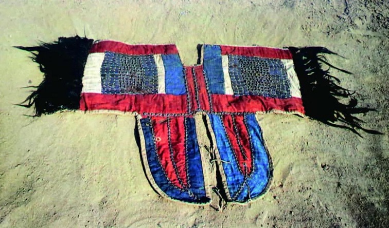 1998年我们对遗址进行复查时,还发现了一件连带鸡颈的身甲,保存非常完好。整个衬底由红、蓝、白三色棉布拼合面成,中间加本色薄毛毡的夹层,衬里是白棉布,上下三层相叠缝制。身甲部分就像一块横长的褥子,马鞍位置留有梯形缺口,两侧边缘垂有牦牛尾巴编成的辫状穗或散穗。鸡颈部分是从身甲前边伸出的一对弧边三角形片。身甲的左右片表面缝缀排列整齐的方形甲片和方形乳钉甲片,身甲中脊和鸡颈部位只是用方形乳钉甲片列成单行缝缀其上,大部分表面并不缝缀甲片,其装饰意义大于实用意义。搭后部分有两种不同样式,都呈长方形,马鞍位置留有缺口,与身甲缺口相对应。其中一件在后侧中间伸出一小块以遮护马尾根部,搭后两侧的面料同身甲一样,也缝缀有排列整齐的方形乳钉甲片,边缘垂有牦牛尾散穗。