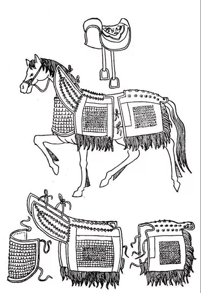 根据在遗址中发现的马具装各部位,我们对古格王国马具装的配置方式在图纸上做出复原,可以看出,除了面帘以外,马身体各部位都得到较好的防护。如果再配上面帘、马鞍、马镫,就可以成为一套完整的铠甲马具装了。