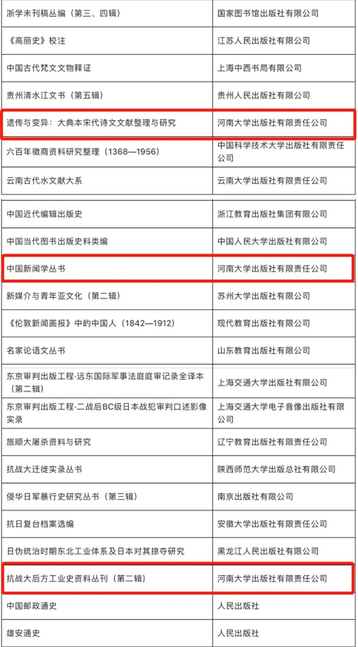 2月26日,国家出版基金规划管理办公室对2020年度国家出版基金项目评审结果予以公告,共有九大类633个图书项目获批。河南大学出版社申报的3个项目《遗传与变异:大典本宋代诗文文献整理与研究》《中国新闻学丛书》《抗战大后方工业史资料丛刊(第二辑)》全部入选。