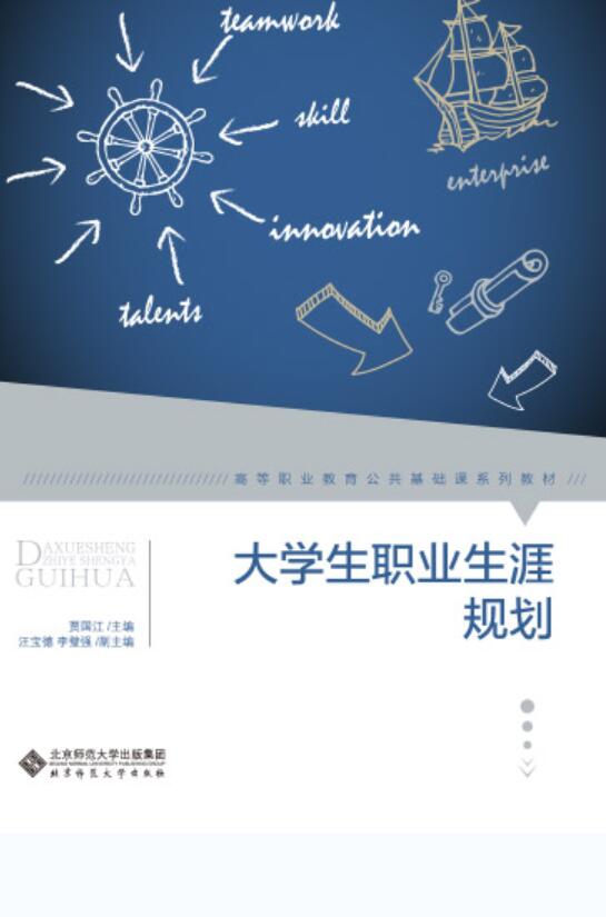 书名: 大学生职业生涯规划 ISBN: 978-7-303-25283-1 条码: 9787303252831 作者: 贾国江 相关图书 印次: 1-1 开本: 16开 定价: ¥32.80 出版社: 北京师范大学出版社 出版日期: 2019-12-18 内容简介: 主要讲解大学生自我认知、职业探索、生涯抉择、发展规划、职业生涯行动等方面的科学理论与方法,旨在帮助大学生获得认识与评估自身素质、探索职业世界、解决职业生涯困惑、明确职业发展方向、制定科学的职业生涯行动方案的能力,促进在校大学生有目的、有计划的学习各类课程、参加社会实践活动,加速大学生成长成才的步伐,为收获理想的职业人生做好准备。可供高校大学生职业生涯规划及就业指导相关课程教学使用,也可作为人力资源培训机构相关培训的参考书。 来源:北京师范大学出版社