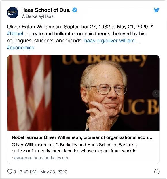 2009年诺贝尔奖得主、交易成本理论的开创者奥利弗·E.威廉姆森(Oliver E. Williamson)于当地时间2020年5月21日逝世,享年87岁。加州大学伯克利分校哈斯商学院(Haas)在其社交媒体上公布了这一消息。