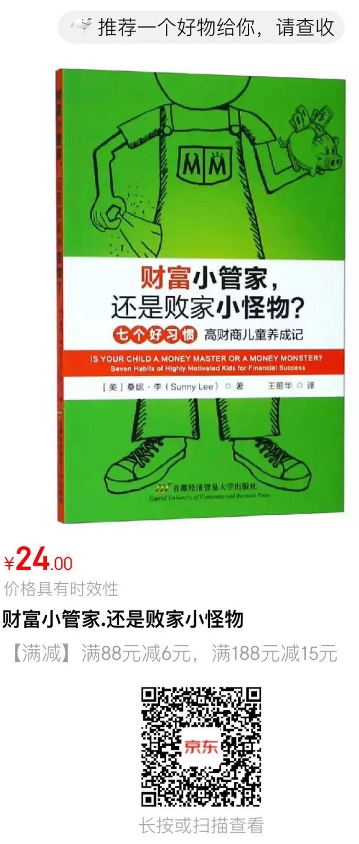 今天为大家介绍的这本书,是由美国职业理财顾问桑妮·李(Sunny Lee)所著的《财富小管家,还是败家小怪物?》。桑妮是一对双胞胎儿子的妈妈,从孩子们两岁开始,桑妮就开始对他们进行财富教育。桑妮发明的一整套奖励系统,不仅让两个儿子11岁的时候就设立和管理自己的储蓄账户、投资账户和大学基金账户,成为实实在在的“财富小管家”,而且让全家的生活变得轻松:孩子们能独立处理早上起床、洗漱、上学、做家务等一系列问题,同时还提高了写作能力,学会了与他人分享。 结合亲身经历,桑妮将她的一整套简单而有趣的系统总结为以下七个习惯。