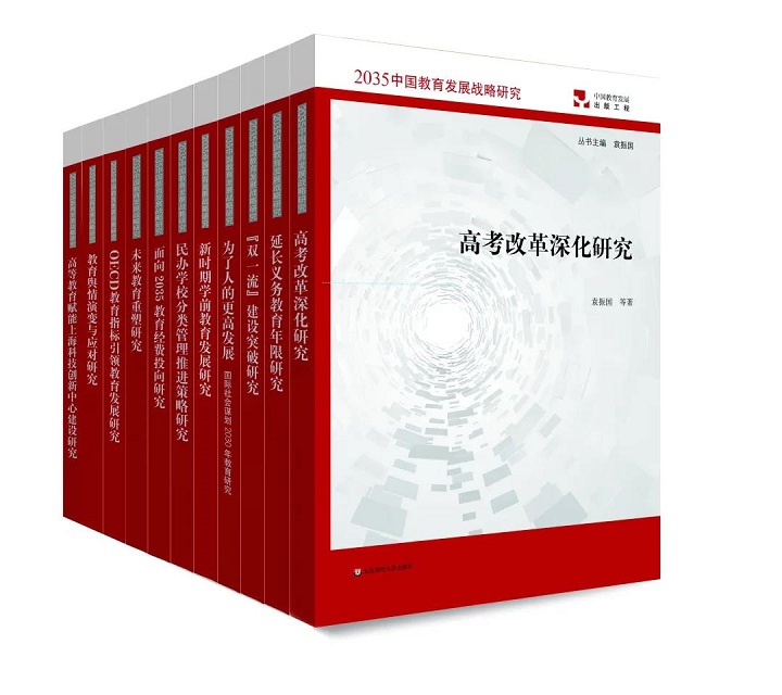 2035中国教育发展战略研究丛书 《高考改革深化研究》 《延长义务教育年限研究》 《“双一流”建设突破研究》 《为了人的更高发展:国际社会谋划2030年教育研究》 《新时期学前教育发展研究》 《民办学校分类管理推进策略研究》 《面向2035教育经费投向研究》 《未来教育重塑研究》 《OECD教育指标引领教育发展研究》 《教育舆情演变与应对研究》 《高等教育赋能上海科技创新中心建设研究》