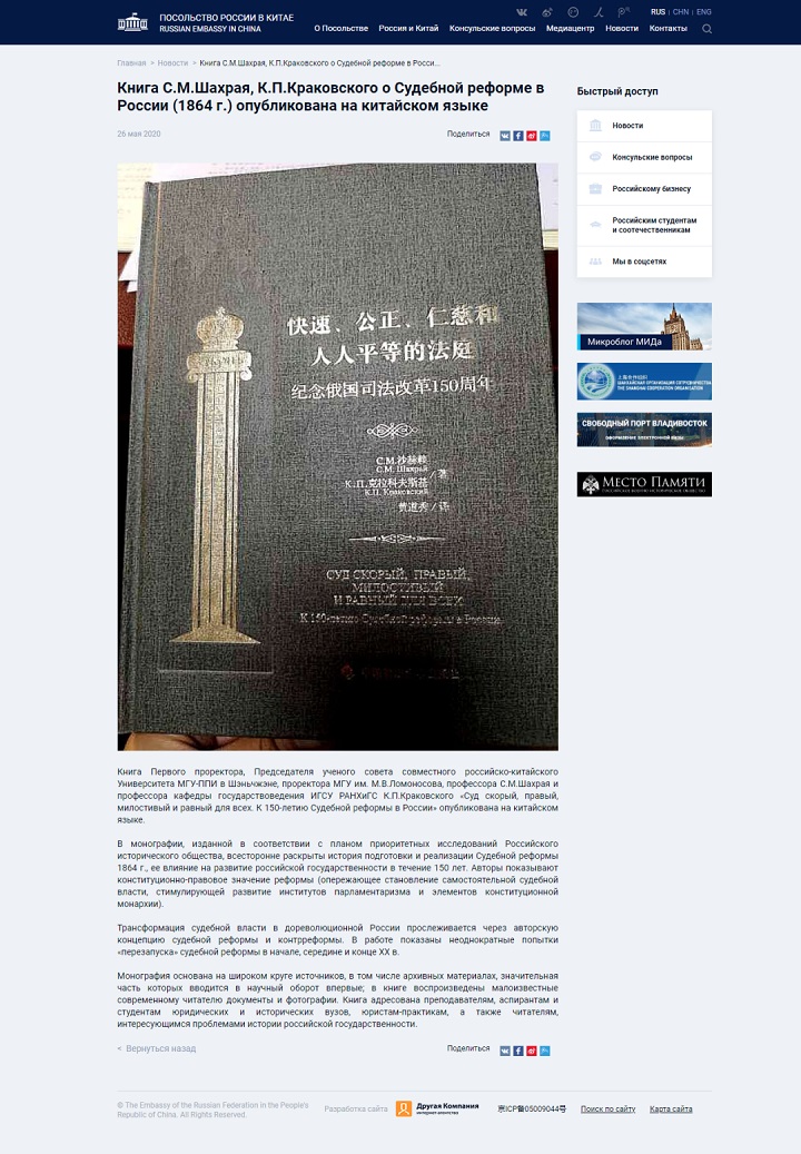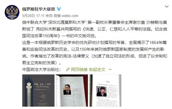 中俄联合大学“深圳北理莫斯科大学” 第一副校长兼董事局主席沙赫赖与克拉科夫斯基共同撰写的《快速、公正、仁慈和人人平等的法庭——纪念俄国司法改革150周年》一书的中文版一经出版,就获得了俄罗斯驻华大使馆的大力推荐和高度赞许,并欣慰地表示:“这部根据俄罗斯历史协会的重点研究计划撰写的专著,揭示了俄国1864年司法改革准备和进行的历史,司法改革对俄罗斯150年来国家体制发展的影响。两位优秀的作者阐述了司法改革的宪法意义——它促使独立司法权的形成,而司法权又激励着议会制度和君主立宪制各种要素的发展。这部专著还涵盖了大量首次展示的珍贵图文史料,是一本值得法律和历史专业高等学校的教师、研究生和大学生,以及对俄罗斯国家体制问题感兴趣的读者们研读和收藏的匠心之作。”