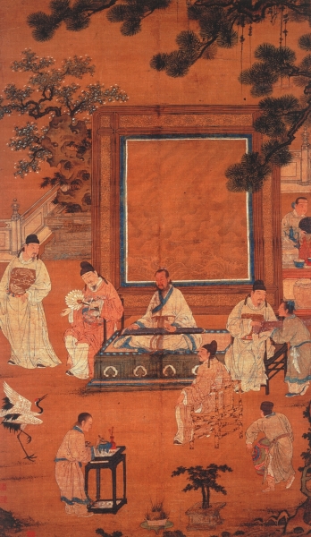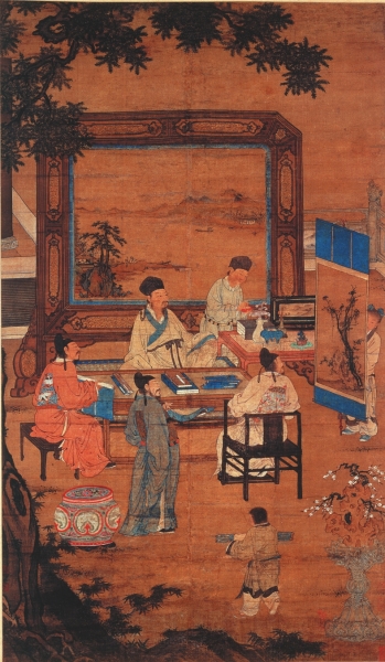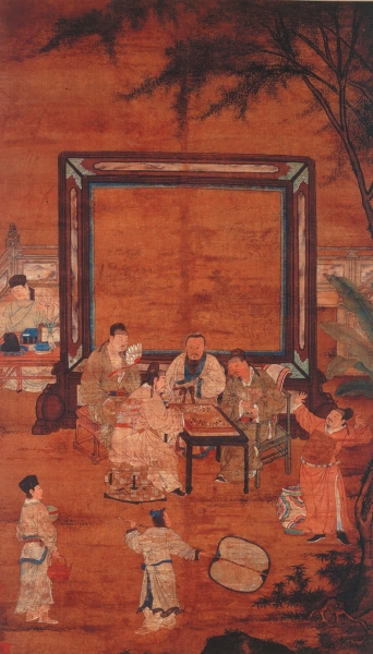 无论它们的起源如何,现存关于“琴棋书画”的中国绘画收藏,连同来自1500年更广泛的物质文化证据显示,这一主题在当时确有市场。如果相关作品像上海博物馆的藏品那样保存完好,那么我们应该能够在画中辨认出十八位成年男子的形象(侍从不计在内),他们象征着辅佐唐太宗(627—649年在位)——他被视为中国古代黄金时期最伟大的皇帝之一——的“贞观十八学士”。因此我们在作品中看到的是一种男性精英举止的典范:不费吹灰之力地掌握了四种形式庄重的消遣,对于这十八位渴望辅佐天子燮理朝纲的士绅来说恰如其分。