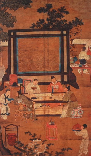 它要么出自南宋的宫廷画家之手,要么就是一幅袭承自南宋宫廷山水画的明代近作。这种绘画风格经历了蒙元期,在南宋的旧都浙江杭州被保存继承下来,因为其地理因素随后被称为“浙派”。我们很难不去指出一个巧合,如果这是一幅传自南宋的作品,那么这些在杏园雅集的宾客对过去宫廷和帝国文化传统的接触在一定程度上可能会为我们所了解。如果画家在这里暗示,这些士绅赏鉴的这幅作品事实上来自杭州职业艺术家,且后者肯定受到了如画中所摹之人的恩庇,那么我们能够证明的就不仅仅只有这些明代文人对于绘画与时俱进的品位,还有当前文化在借鉴过去饱受赞誉的艺术实践时,艺术家对于方法的把握。无论如何,《杏园雅集图》展现了一种杂糅了歧视与学问,且与精英绘画有限的接触有关的观赏形式。