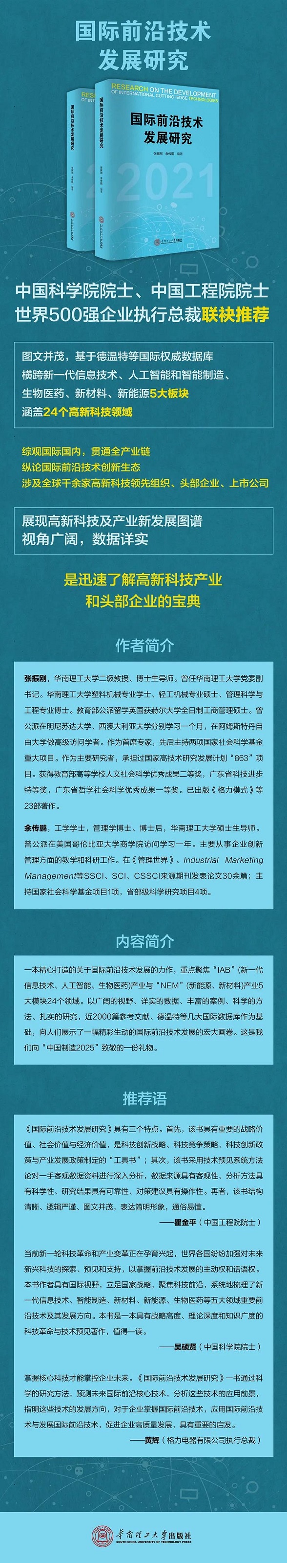 书名:国际前沿技术发展研究(订购) 作者:张振刚 余传鹏 编著 装帧形式:精装 出版时间:2021年1月 ISBN:978-7-5623-6593-8 开本:16开 版次:1-1 字数:96.7万字 页数:636页 定价:198.00元