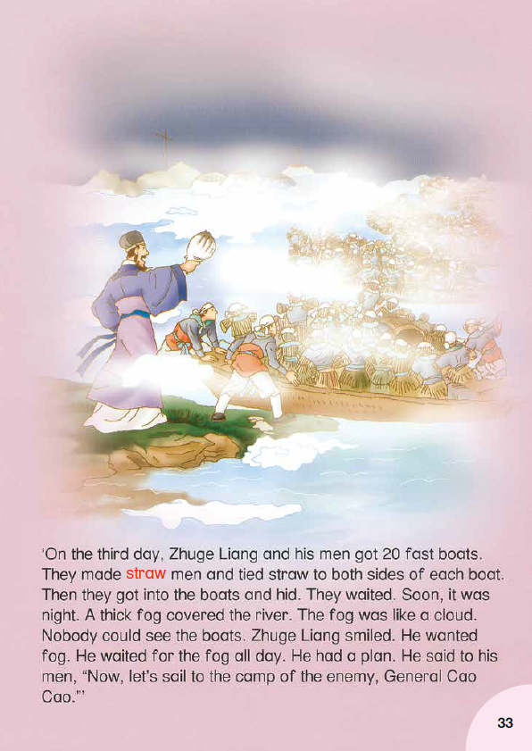 第三天,诸葛亮和手下开始了行动。他们备了20艘快艇,做了些稻草人(straw men)并将茅草绑在船身两侧,自己藏身于船中等待着。不久,夜幕降临,一场大雾将河面笼罩起来,诸葛亮微微一笑,一行人随即动身前往敌营。