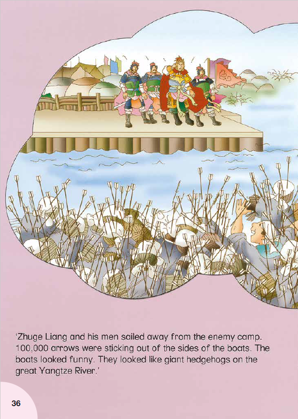 不一会儿,成千上万支箭从天而降,仿佛一场箭雨,都射在了干草上。这些船就像辽阔的长江江面上一列庞大的刺猬。(They looked like giant hedgehogs on the great Yangtze River.)随后,天亮雾散了。诸葛亮冲着曹营大喊:“谢谢你们的箭!我们借走了,不久还会送回来的。”通过这件事,周瑜对诸葛亮刮目相看,十分佩服。