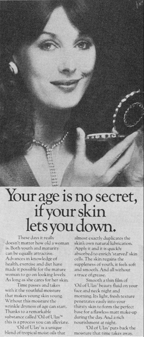 A33:这里想表达的是你的皮肤可能会“让你失望”,说明它被看作与“你”分离的东西。你和图中女人依然有差别,因为你如她所说在担心你的皮肤会不会让你失望,而她的皮肤显然完美无缺。留意她拿着一张镜子,但没有在看。她直接看向观众:所以这让我们想起了镜像关系,但鉴于站在广告前的是我们,我们就取代了“她”和“我们”之间隐形的镜子。 这两个“镜子”广告直指你的脸和皮肤,这不是巧合。这是生产商从字面意义上挪用了你。他们的产品可以用薄薄的一层化学面膜覆盖你:你在镜中看到的表面同样可能是“他们的”,而不是“你的”,例如A32中是安妮·弗兰西的“美丽面膜”。镜中你的外表、你的脸已经成为客体;所以它也很容易就成为制造商的财产——并被看作可以买卖的。所以我们的脸被镜子剥离(你看不见你自己的脸),它可以被完全剥夺,因为只有我们的脸出现在画面上,与我们保持距离时,我们才能看到自己完整的脸;在接下来的广告中,我们的脸不再是作为消费者的我们的一部分,而变成了产品的一部分,并被我们买回来重塑自己。 这暗示着我们可以和我们被挪用的形象重新获得统一;我们的脸永远是镜中的他者,但又确实属于我们,所以为什么这些脸不能成为“我们的”?