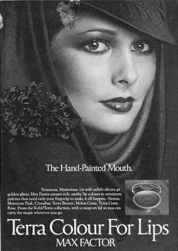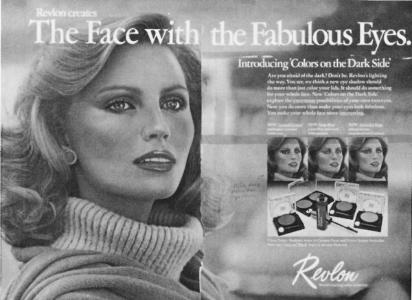 A36:这里,眼睛是脸上被特别塑造的部分。这里的关键词是“塑造”:露华浓塑造了你的脸——简单地让它成为“这张”脸,或者任何脸。这是一件产品;露华浓实际上只是制作化妆品,但化妆品被等同于脸。眼睛被重点强调:这张脸加上这双完美的眼睛。量词在这里突出强调了这张脸的物质性;三张小图表明这张脸确实是可以量产的。这些小图中的眼影颜色各异,脸却一模一样。这表明脸仅仅是个傀儡,只是为眼影色号提供展示场地。此外还需看到,这双完美的眼睛并不直视着你:视线穿透了你。这里,脸和眼睛与我们分离到底,被看作客体,甚至没有通过对视和我们产生一点点关联。
