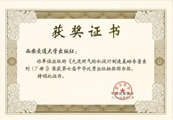 西安交通大学出版社出版的“先进燃气轮机设计制造基础专著系列”,不仅赢得了专家学者们的如此好评,还入选国家新闻出版署“十二五”重点出版规划、获国家出版基金支持,并荣获“中华优秀出版物奖图书奖”(获奖证书如下)。