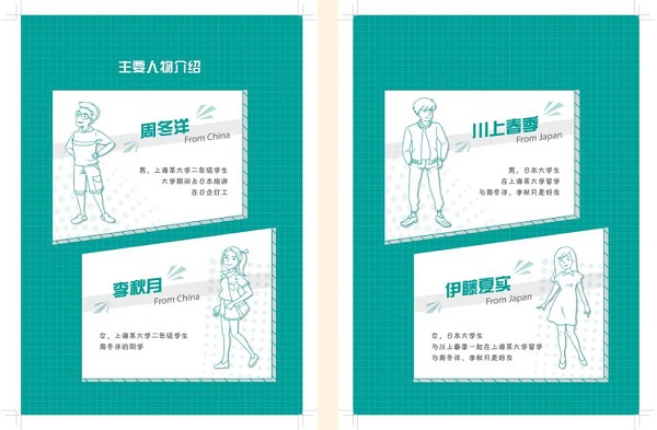 各册教材之间以时间顺序串联,内容围绕四名主人公(周冬洋、李秋月、川上春季、伊藤夏实)的活动逐渐展开,讲述了两名日本留学生到中国留学,与两名中国大学生成为好友并不断成长、交流学习和生活感受、共同体验中日文化的故事。