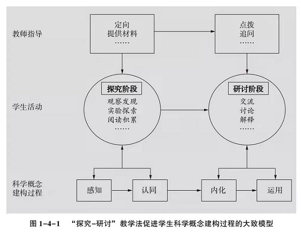 兰本达教授说:“就我而言,概念是每节课的指路灯。”她的目标是让儿童的概念逐步在两个维度上得到发展:一是提高概念的水平,二是提高概念的功能,逐步使分散的概念互相关联,形成概念网络。兰本达认为,儿童建立概念的基础应该是“儿童用自己的语言来表达自己的想法”。因为“孩子们在摆弄操作材料时,许多发现进到了他们的头脑里,但只是些不明确的、片段的、易变的前语言信息。当孩子们一旦分享他们的发现时,通常会争相把他们的思维活动转变成语言,这一过程使思维活动被表达出来,而语言表达的活动又会影响后面的语言”。同时,“因为那些关于事实的陈述是孩子们自己的,那些陈述对每个孩子都是有意义的,而不是对成人的系统阐述的重复”。“探究—研讨”教学法促进学生科学概念建构的过程大致模型如图1-4-1所示。