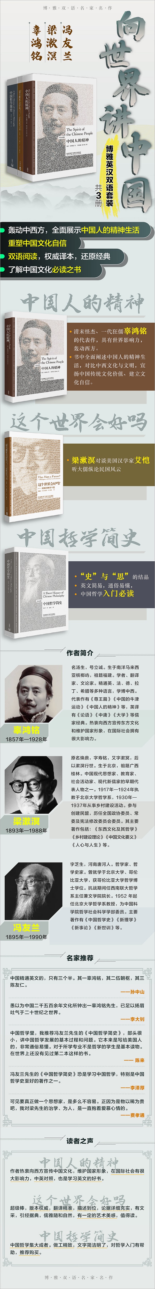套装共三本书:《中国人的精神》《中国哲学简史》《这个世界会好吗?》旨在囊括博雅系列中的国学大师经典,向读者介绍大师们最精华的思想文化内核。