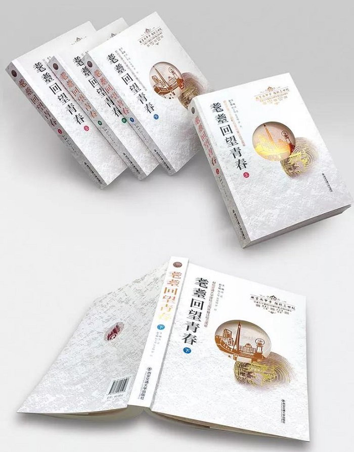 《耄耋回望青春》系列图书的设计则以“年轮”做情感纽带,将二个空间与太阳交相辉映的瞬间用模切镂空的方式做出,聚焦主题,形成亮点,所有信息围绕主图形布局,于含蓄中突出图形与时间的魅力。这种版面布局和印刷工艺新颖时尚,不落俗套,使得这套书更具观赏效果和收藏价值。