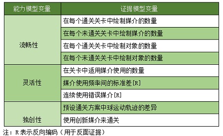 为了评估游戏中的这些创造性行为,研究者们确定了创造力能力模型中的三个变量——流畅性、灵活性和独创性,并确定了游戏中可为这些变量提供证据的可观察指标(即证据模型变量)。表4-1总结了《物理游乐场》中创造力的能力模型变量和证据模型变量(即指标)。