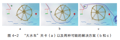 图4-2展示了如何利用上述变量评估《物理游乐场》玩家的创造力。图4-2a展示了名为“大水车”游戏的第一关。小球在重力作用下下落,落至屏幕之外,然后再度出现在初始位置。这种循环会持续到玩家进行绘制操作,使小球转向气球为止。《物理游乐场》玩家常规的解决方法包括在逆时针旋转的水车下方绘制斜坡以引导并推动小球(见图4-2b)。任何偏离了图4-2b所示轨迹而又成功通关的尝试都可以为独创性提供证据,因为这可能是一种不常见、新颖的解决方案。而且,若不采取从水车下方引导的方式,玩家只有很短的时间在原始位置接住小球并以其他方式将小球定向至气球位置。只有很少的玩家采用了类似于图4-2c的解决方案,引导小球在水车上方移动。在这种情况下,玩家创造了一个杠杆,将球困在了杠杆左侧的圆形区域内,在杠杆的右侧创造了重物,并将水车本身用作支点。配重的杠杆将小球拉低并引导至气球位置。这种解决方案为独创性提供了积极的证据。也就是说,此种解决方案中偏离了常规路径的小球轨迹(虚线所示),以及使用预期以外的介质(杠杆)为独创性提供了证据。