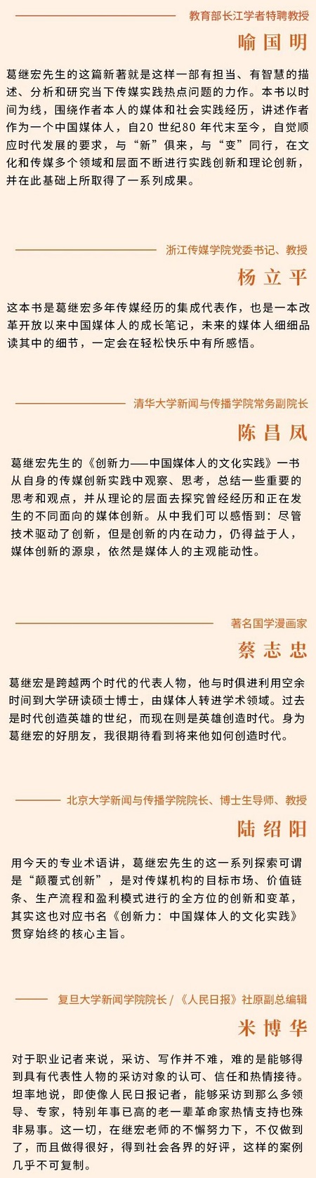 本书从中国知名媒体人葛继宏教授十大教科书级案例出发,破解中国媒体人的创新法则,思索和梳理改革开放四十多年来中国传媒业的发展脉络,坚定弘扬“文化自信”,着力提出能够体现中国立场、中国智慧、中国价值的中国媒体人的实践理念、主张、方案,向世界传播当代中国价值观念。正文以时间顺序为脉络,形成十章。每章以小见大,以时代背景下的个人典型案例,聚焦改革开放以来中国特色社会主义思想的生动阐释与广泛传播,重大影响与价值传承,结合新闻传播学等学科权威专家评述,分析归纳总结中国文化发展中媒体人的成功经验,突出中国媒体人的创新实践意义,独特的社会责任感和使命担当。