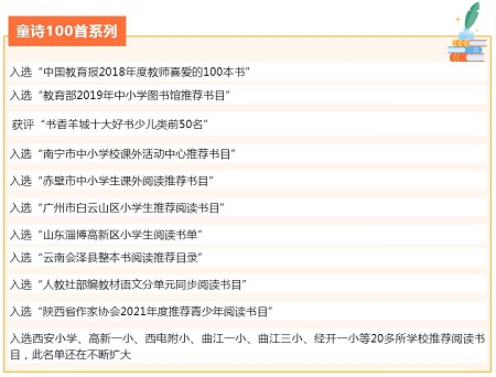 本书单共9种图书,分别是:《长辫子老师漫读必背古诗文130篇》《中国经典童诗诵读100首》《中国经典童谣诵读100首》《外国经典童诗诵读100首》《王宜振精品童诗诵读100首》《童诗心语歌百年(视频版)》。