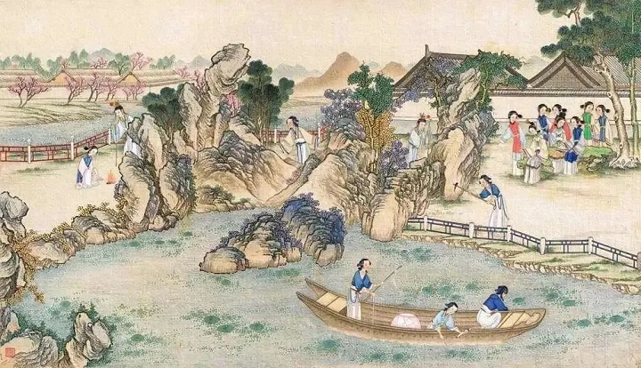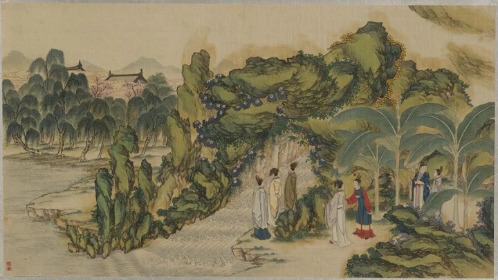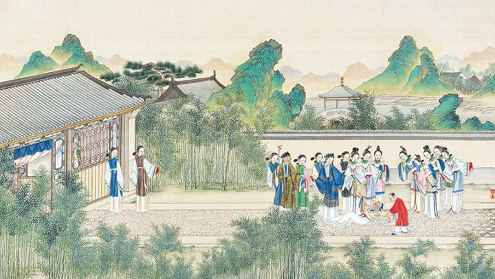 (清代画家孙温手绘“大观园试才题对额”场景)
