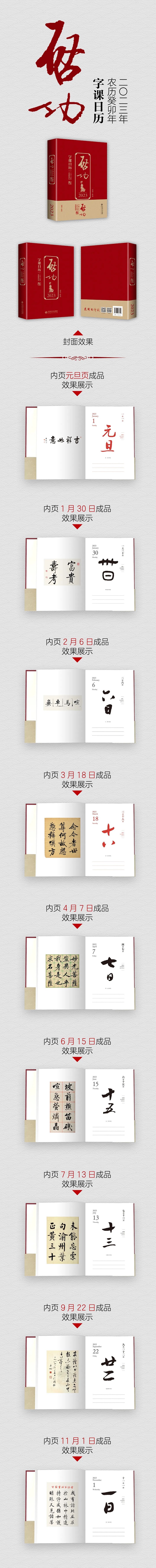 本书的编排体例按月分类进行,日期部分为历代著名书法家的书法作品集字;传统节日和二十四节气则采用启功先生的作品集字。