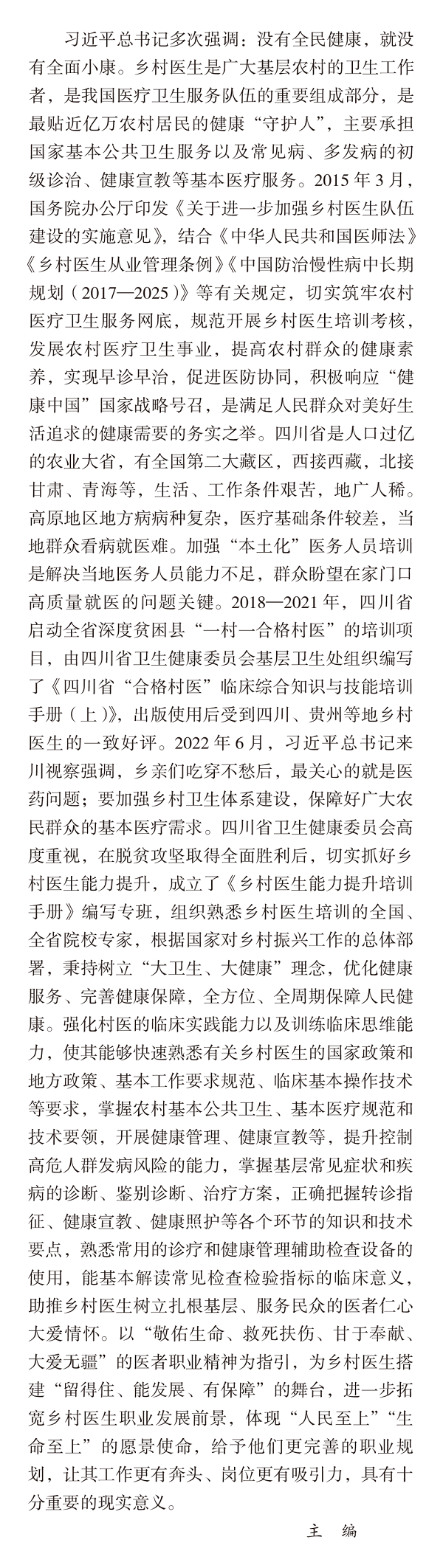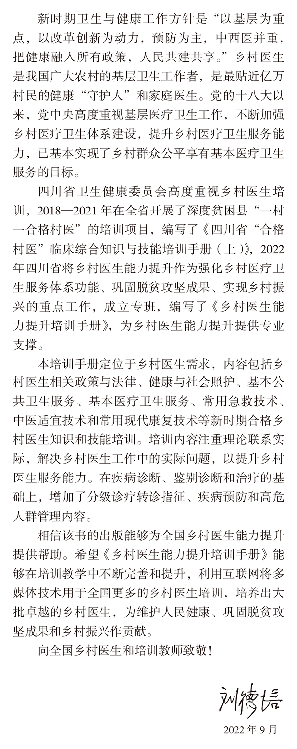 党的十八大以来,党中央高度重视基层医疗卫生工作,不断加强乡村医疗卫生体系建设,提升乡村医疗卫生服务能力。2022年四川省将乡村医生能力提升作为强化乡村医疗卫生服务体系功能、巩固脱贫攻坚成果、实现乡村振兴的重点工作,成立专班,编写了《乡村医生能力提升培训手册》,希望能为乡村医生能力提升提供专业支撑。