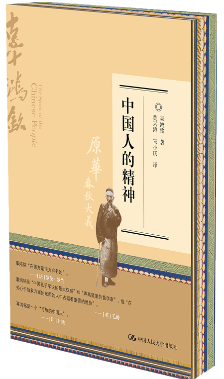 辜鸿铭一生著作多用英语写成,《中国人的精神》是一战前后世界范围内兴起的东方文化思潮的代表作之一,也是他最有影响、最具代表性的著作。该书原名《春秋大义》,又名《原华》,主旨在于揭示中国人的精神生活,阐发中国传统文化的价值,鼓吹儒家文明救西论。书中强调中华民族具有深沉、博大、淳朴和灵敏四大特征,指出儒家不是宗教,却在中国扮演了宗教的角色,并对中西文化进行了多方比较。本书出版后,立刻在西方尤其是德国产生轰动效应,很快就有了德文、法文等译本,后来还被译成日文。