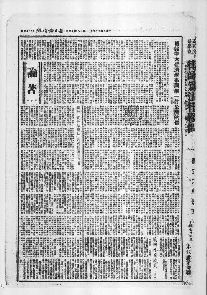 怎么办呢?就在编辑部的同仁们“踏破铁鞋无觅处”之际,中山大学的一个参访团来到厦大,其中就有中大图书馆的同志。厦大出版社的宋编审在向参访团介绍厦大百年校庆图书出版情况时,特地提到了这封信,并请他们帮忙从馆藏中寻找。不久,从中大方面传来了好消息:他们在馆藏缩微胶卷中查到了这封信的“出处”。原来,这封公开信不是发表在杂志上,而是发表在报纸上,即《每日论坛报》;时间也不是含糊的“十一月”,而是准确的“十一月廿八日”。随后,他们给编辑部传来了公开信的影印件。