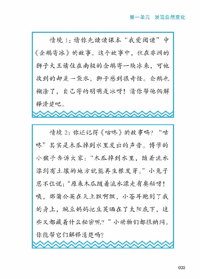 我们又一起回忆了曾经学过的《咕咚》等文章,从熟悉的课文入手,很自然的引出了本单元的学习——对大自然的探索。此时我们还对以前的教学流程稍作修改,引导学生先来阅读《我爱阅读》中的《企鹅寄冰》。学生们的自然知识其实是很丰富的,很快就理解了文章的内容。