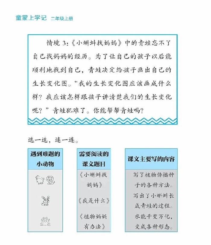 开学的第一堂课,我利用《童蒙上学记》这本书创设的情境,引入童童和蒙蒙两个小同学和班里的学生一起学习,学生们特别感兴趣。