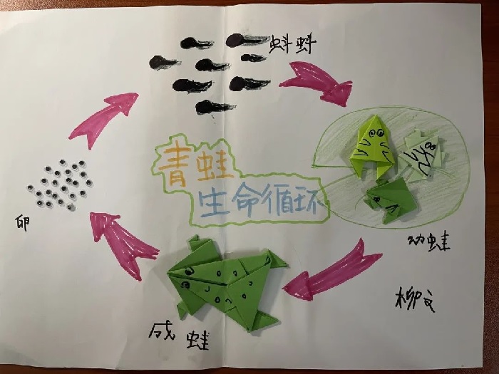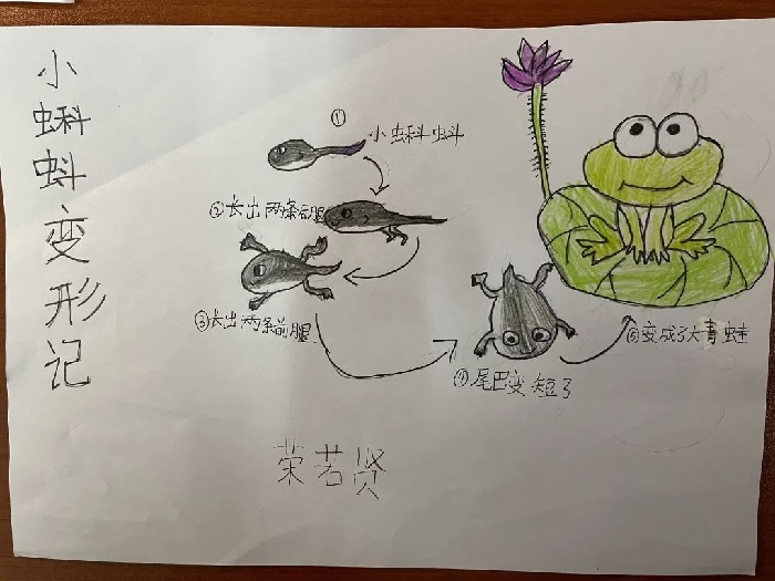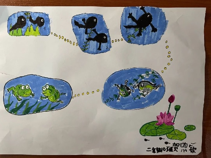 接着我们进行了第一课《小蝌蚪找妈妈》的学习。有了前期的铺垫,学生们对于课文的学习充满期待。整篇课文学完后,学生对青蛙的生长变化过程有了一个大致的了解,但好多同学是机械记忆的。这时我采用了书中建议的画一画青蛙的生长变化图。