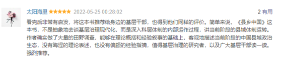 有位读者在网上的留言中这样写道:“《县乡中国》这本书,不是抽象地去谈基层治理现代化,而是深入科层体制的内部运转过程,讲当前阶段的县域体制运转。作者确实做了大量的田野调查,能够在理论概括和经验叙事的基础上,客观地描述当前阶段的中国县域政治生态,没有晦涩的理论表述,也没有偏颇的经验指摘。”