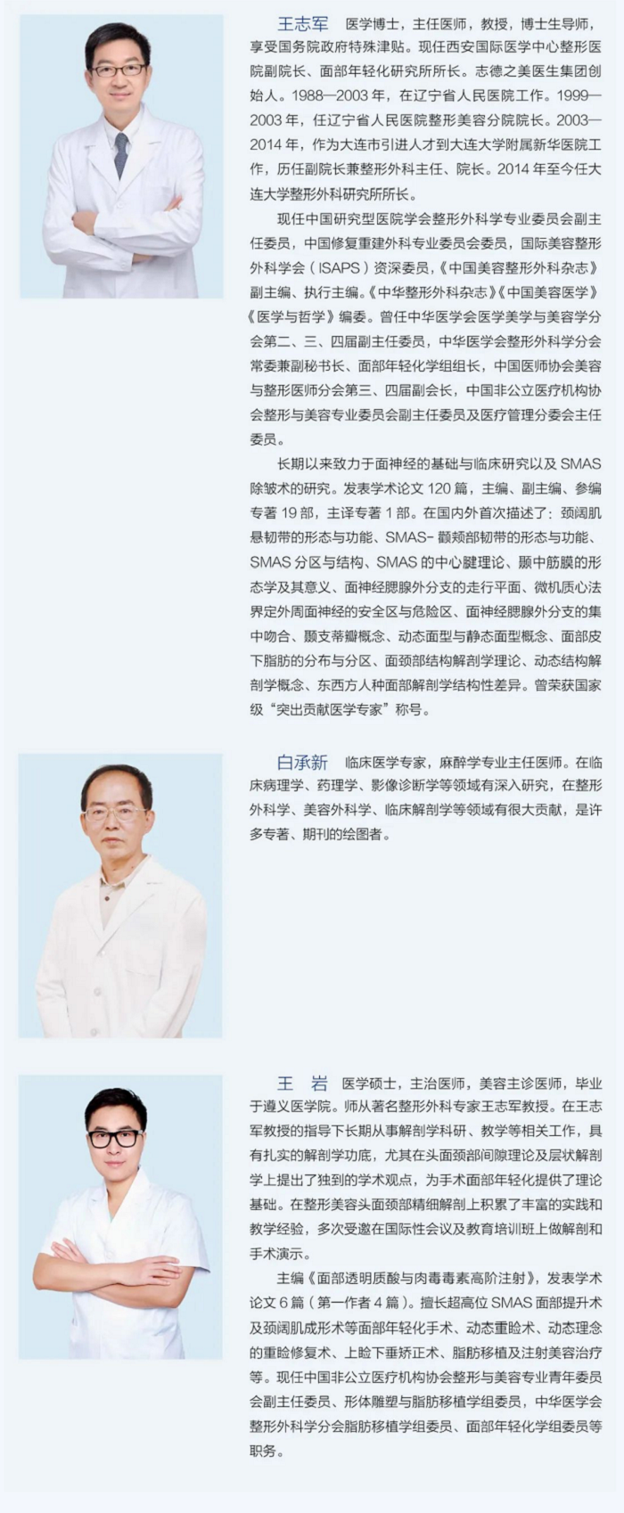 好的外科医生一生做三件事:做手术、做研究、做教学,即所谓‘医教研’,能同时做好这三件事的医生并不多,但王志军教授的团队做到了这一点。几十年来,王志军教授所率领的团队一边做解剖研究,一边做临床技术创新。久而久之,他们成了国内面部临床解剖做得最多的团队,成了国内面部年轻化手术做得最多的团队,也是国内面部临床解剖培训开展得最多、最好的团队。”