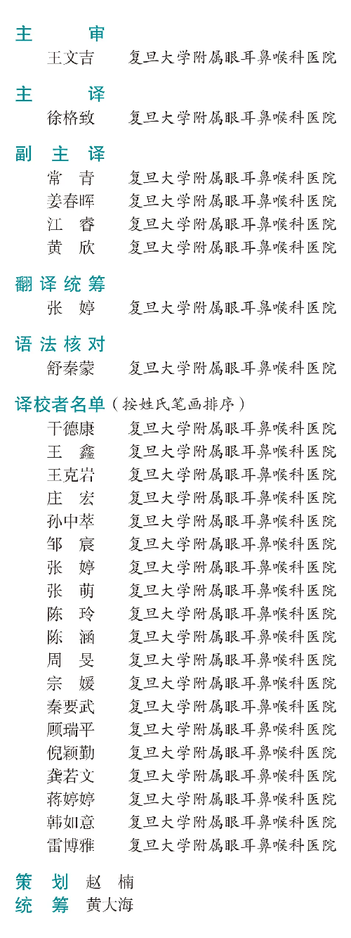 本书中文版由复旦大学附属眼耳鼻喉科医院徐格致教授组织复旦大学附属眼耳鼻喉科医院多位专家学者精心翻译、严谨审校,完整准确地展示了原书内容。